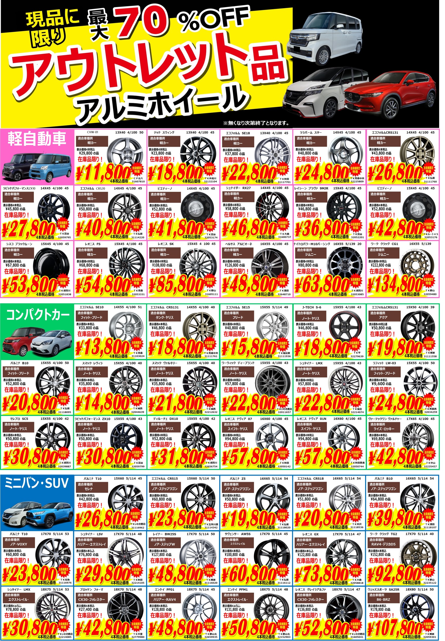 そろそろホイールを新調してみませんか? ポスト 2023年1月13日 いつも当店のWEBをご覧いただきありがとうございます。 アルミホイールの擦り傷や腐食、塗装のはがれが気になっている方へ朗報! 長年使用でディスク表面のクリアがはがれて白く腐食しています。 今ご使用中のホイールが同じようになっていて新品交換をご検討中のかたへ サイズが合えばラッキー!お得にご購入いただけます。(現品限り) 商品によっては取り寄せとなる場合もありますので、店頭にてご確認ください。
