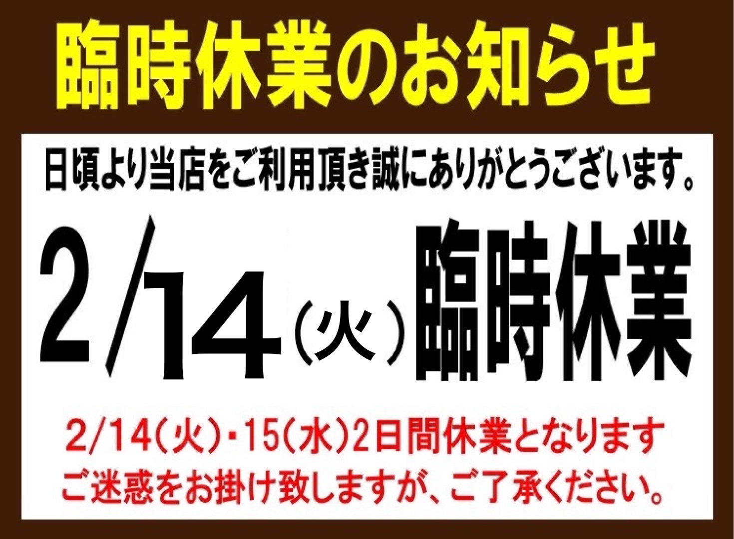 2月14日(火)15日 (水)は臨時休業となります ポスト 2023年2月13日 こんにちは! 臨時休業のお知らせです 2月14日(火)と15(水)の2日間休業となります ご迷惑をお掛け致しますが、ご了承下さい 住所〒037-0004青森県五所川原市大字唐笠柳字藤巻546-4 電話番号0173-26-7715 FAX0173-26-7716 営業時間10:30~19:00 定休日水曜日 担当:須藤