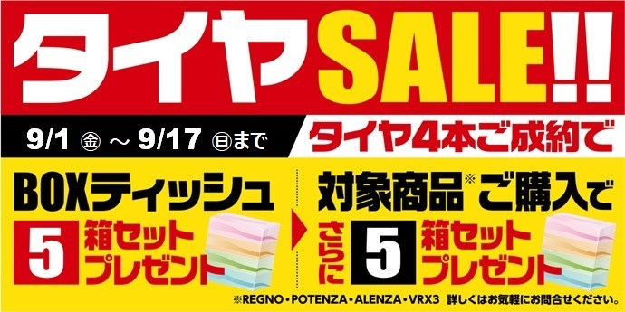 タイヤ4本ご購入でBOXティッシュ5箱セットプレゼント!