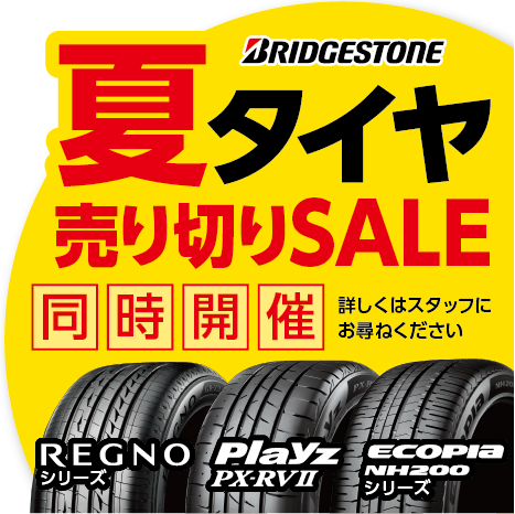 夏タイヤ売り切りセールやってます! ポスト 2023年11月18日 いつも当店のWEBをご覧いただきありがとうございます。 スタッドレスタイヤへ交換はお済ですか? 交換した時に夏タイヤの状態はどうでしたか? そういえば減っていたなぁあ、交換をおすすめされたという方、必見!! シーズンオフの今だから夏タイヤもお買い得プライスで大放出中! この機会をお見逃しなくご来店ご相談下さい・・・