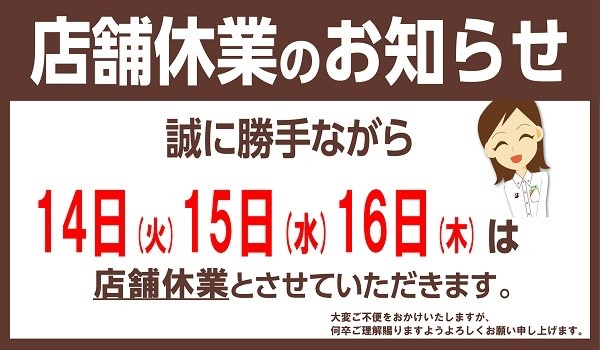 店舗休業のお知らせ! ポスト 2024年5月9日 こんにちは! いつも当店のWEBをご覧いただきありがとうございます 店舗休業のお知らせです ご不便をおかけお掛け致しますがご理解とご協力をよろしくお願いいたします。
