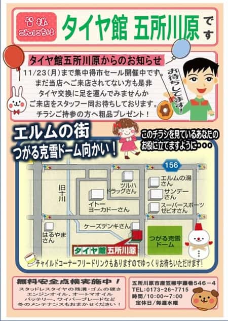 冬支度してますか? ポスト 2015年11月19日 そろそろ本格的な冬がやってきます。タイヤ交換はもうお済みですか?まだ夏タイヤでこの週末に交換をご検討中の方へタイヤ交換と一緒にお車の点検もおすすめします。当店ではタイヤ、ホイールの他にもメンテナンス用品も取り揃えております。ただいま集中得市セール期間中ですのでタイヤもメンテもお買得価格になっております。お気軽にお立ち寄り下さい。