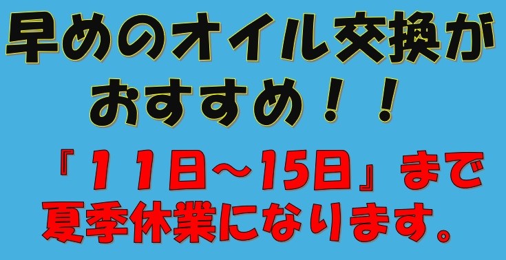 早めのオイル交換がおすすめ!!『11日~15日まで夏季休業になります。』