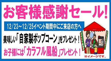 12月23日~25日はお客様感謝セールイベント開催! ポスト 2016年12月22日 日頃、ご愛顧頂いているお客様に感謝の気持ちを込めてイベントを開催します。 期間中、ご来店のお客様にポップコーンをプレゼント! ご家族連れのお子様にはカラフル風船をご用意しました。 まだ当店をご利用頂いてない方も大歓迎です。 カテゴリ:お知らせ