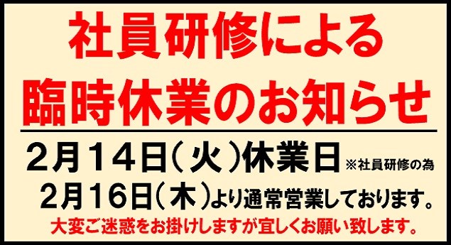 臨時休業のお知らせ ポスト 2017年2月13日 誠に勝手ながら、2月14日(火)社員研修の為、臨時休業と させていただきます。 大変ご迷惑をおかけいたしますが宜しくお願いいたします。 2月15日(水)は定休日ですので2月16日(木)より 通常営業となります。 カテゴリ:お知らせ