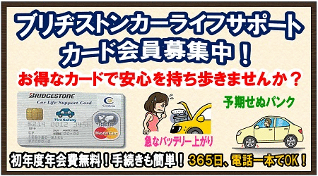 バッテリーの調子はいかがですか? ポスト 2017年5月25日 最近のバッテリーは高性能で寿命が長くなっていて 性能低下が分かりにくく突然エンジンがかからなくなる 場合も多くみられます。 ドライブやレジャーなどでの出先でバッテリー上がって 困らないように点検をおすすめします。 当店では無料点検サービスとロードサービス付帯の ブリヂストンカーライフサポートカードで皆様の 安全と安心をサポートしております。 カテゴリ:お知らせ