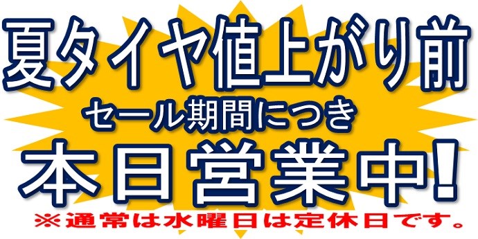 5月31日(水) 定休日は通常営業しております。 ポスト 2017年5月31日 夏タイヤ値上がり前の大奉仕セール最終日! 本日営業しております。 夏タイヤをご検討中の方お見逃しなく! カテゴリ:お知らせ
