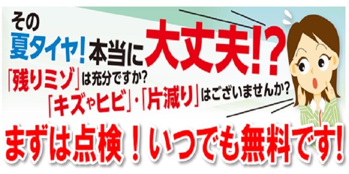 決算セールお見逃しなく! ポスト 2017年7月1日 決算セール大好評開催中です! 明日、いよいよ最終日となりますので、今シーズン夏タイヤやスタッドレスタイヤを ご購入をご検討中の方は、お気軽にご来店ください。 タイヤの点検も無料で実施しておりますので、お立ち寄りください。