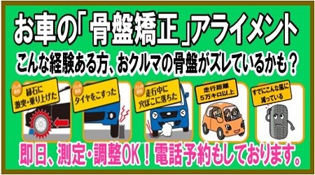タイヤ長持ちの秘訣! ポスト 2017年7月10日 車のタイヤの角度は自然にズレていきます。 だから、車には足回りの角度を調整できるようになっています。 タイヤの減り方やハンドルのズレ、ふらつき等の症状が見られる場合は 要注意です!タイヤを長く、上手に使いきるためにも 一度、アライメント測定をしてメーカー基準値から角度がズレていたら 適正な角度にアライメント調整することをおすすめします!