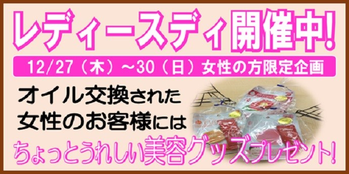 明日からレディースデイ ポスト 2019年5月15日 毎週木曜日はレディーデイ 今回は5/16~19まで4日間限定で開催しております。 平日はお仕事を頑張っている女性の方もこの期間に 是非、お気軽にご来店ください。 オイル交換された方へ「ちょっとうれしい美容グッズ」を ご用意してお待ちしております!