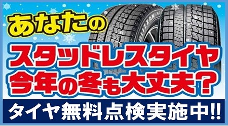 ご使用中のタイヤは大丈夫!? ポスト 2019年11月23日 当店のWEBをご覧頂きありがとうございます!! この間の降雪で、取り合えずスタッドレスタイヤへ交換された方も おられると思いますが、今ご使用中のスタッドレスタイヤの 状態は大丈夫ですか? タイヤ交換に行った先のお店でそろそろ交換が必要ですね! とタイヤ交換をおすすめされた方、今一度タイヤ点検を 当店でしてみませんか?点検はもちろん無料です。 お気軽にご来店下さい。