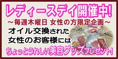 いつも当店のWEBをご覧頂きありがとうございます。 女性ドライバーの方に大好評レディースデイ! オイル交換をはじめとするメンテナンスがお得に! 更に、女性の方、限定で「ちょっとうれしいプレゼント」や ヘッドライトコーティング、ウィンドーウォッシャー満タン補充など 無料でサービスしてお...