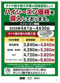 タイヤ交換(脱着)に関するお知らせです!◆ハイシーズン価格について◆