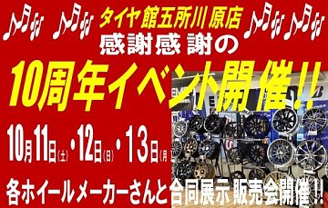 いつもご覧いただきありがとうございます。 タイヤ館五所川原 10周年記イベント開催のお知らせです!! 本日はホイールメーカーさん在中です!! 10月11日(土)~13日(月)の3日間 各ホイールメーカーさん合同展示販売会を開催いたします。 ・ホイール買替検討されている方 ・気になってい...