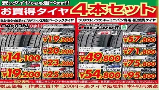 (上記価格はすべて税込表示です。※作業工賃・廃タイヤ処理料は別途です。)