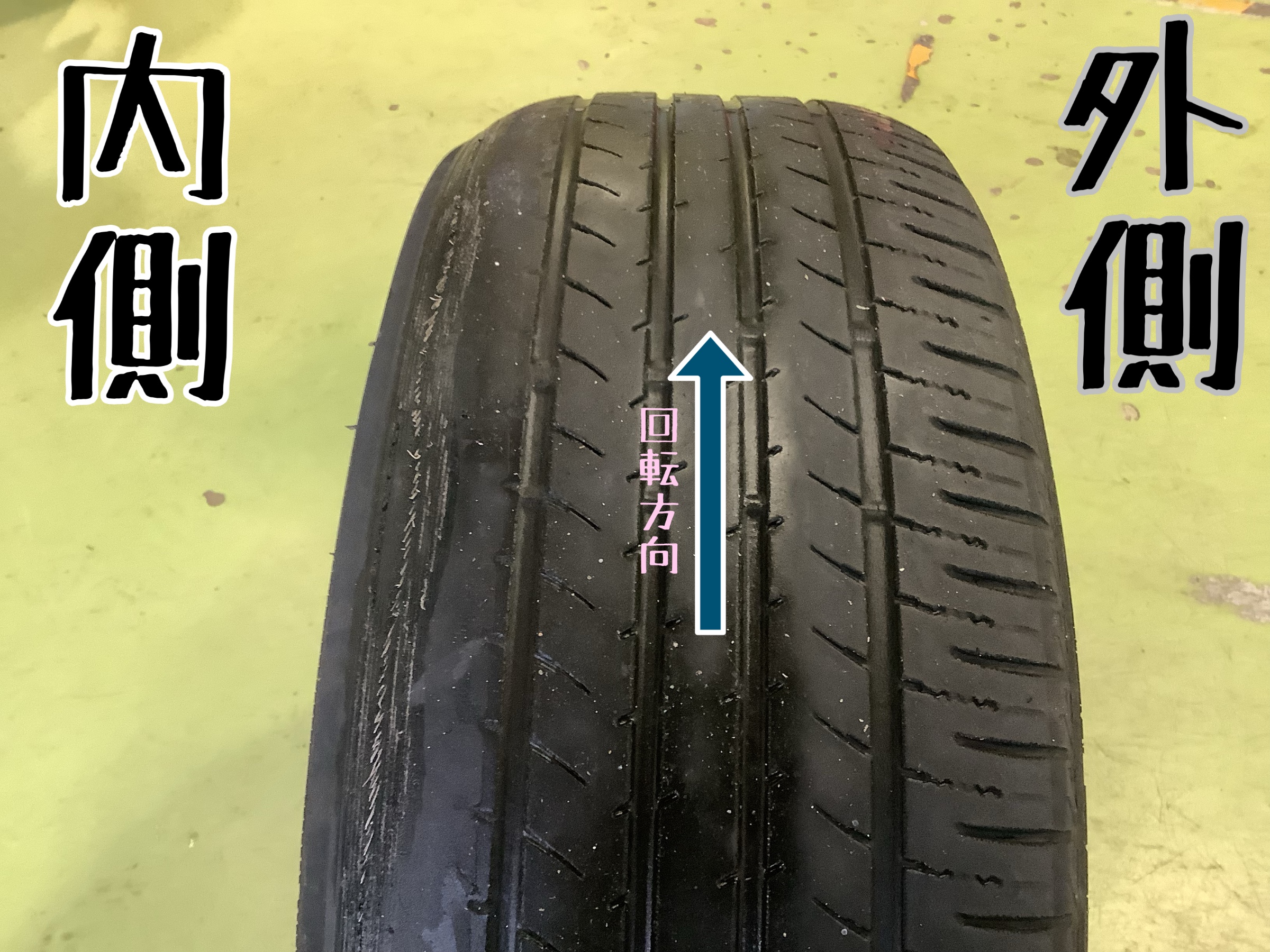 こちらが交換前のタイヤになります。写真の通り内側が片減りしておりゴムの下にあるワイヤーが露出しておりかなり危険な状態でご来店されました(。-∀-)