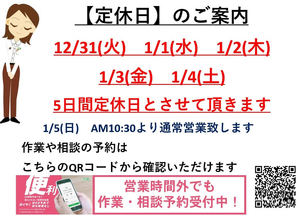 年末年始お休みのご案内【12/31(火)~1/4(土) 5日間お休みとなります】☆タイヤ購入は24時間WEBからOK☆作業予約もWEBからできます☆