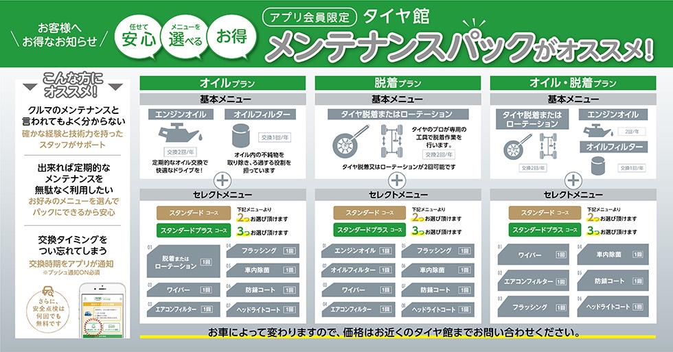 オイル交換、夏タイヤ冬タイヤの脱着(履き替え)をされる方へのお得なパックが存在します!!