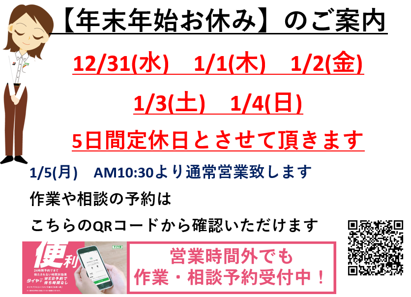年末年始お休みのご案内☆タイヤ購入は24時間WEBからOK☆作業予約もWEBからできます☆