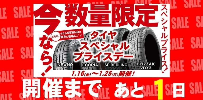 ☆タイヤ スペシャルプライスデー開催まで あと1日!☆