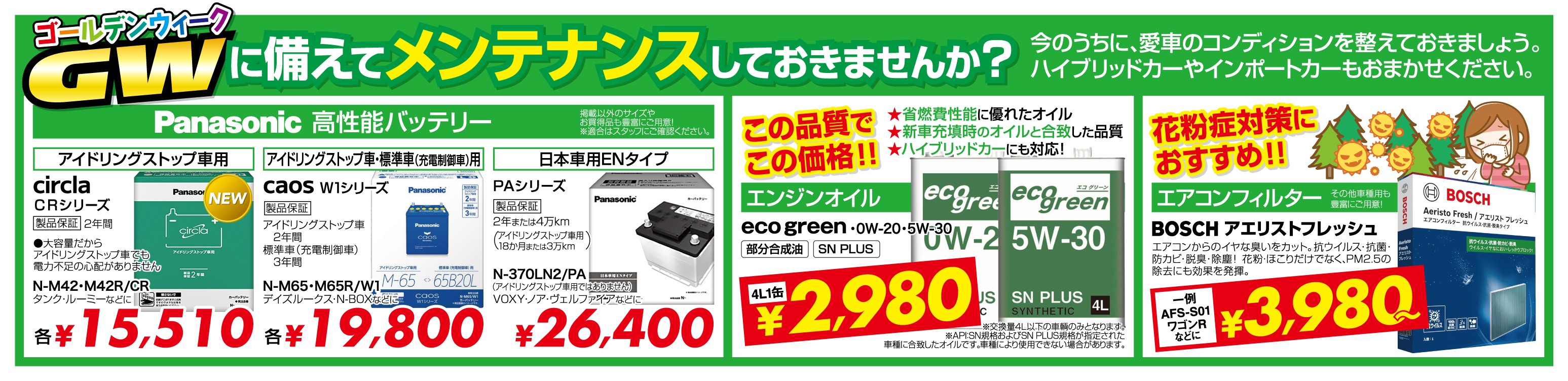 ゴールデンウィーク前は、タイヤだけでなく 車全体のメンテナンス がとても重要です。 タイヤ館グリーンピット大阪箕面では、以下の基本メンテナンスもプロのスタッフが丁寧に点検・交換いたします。