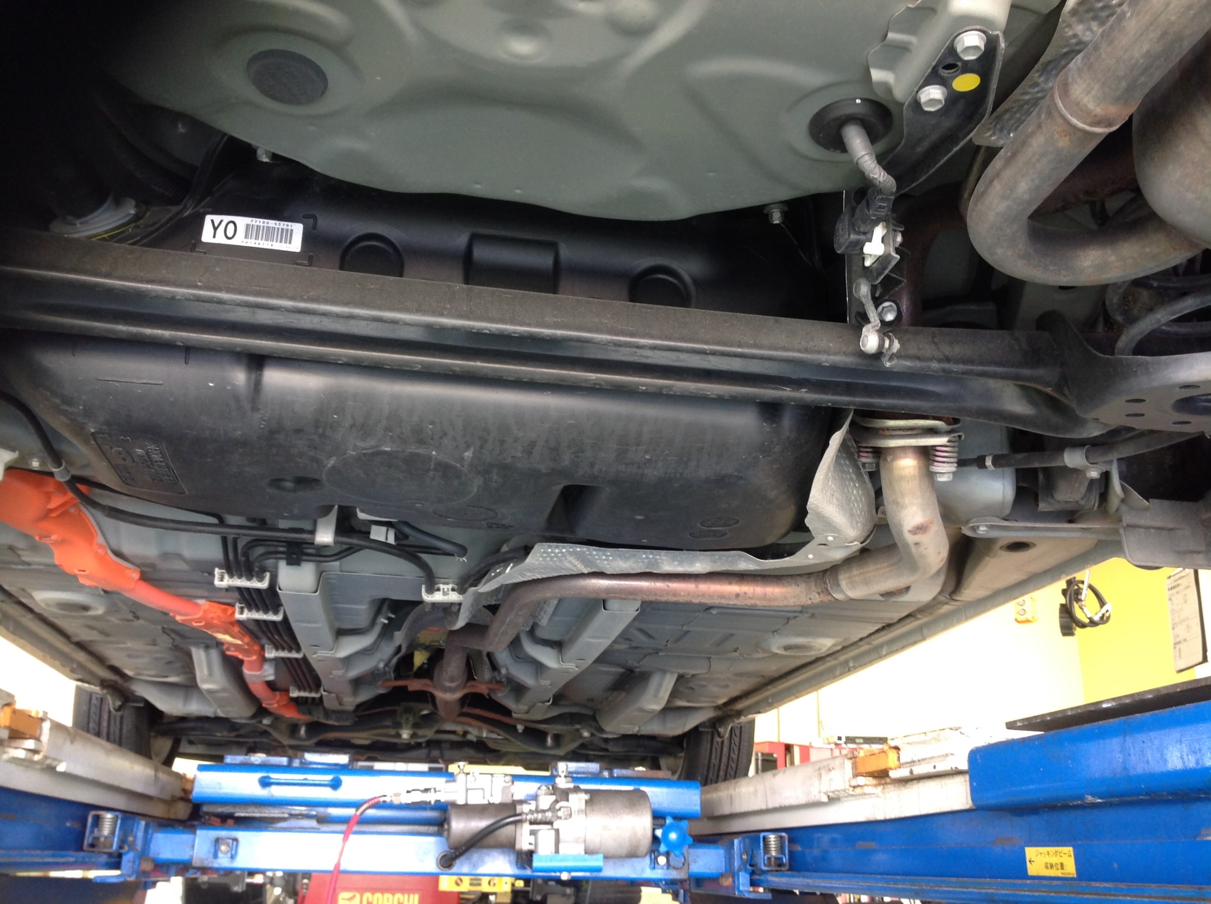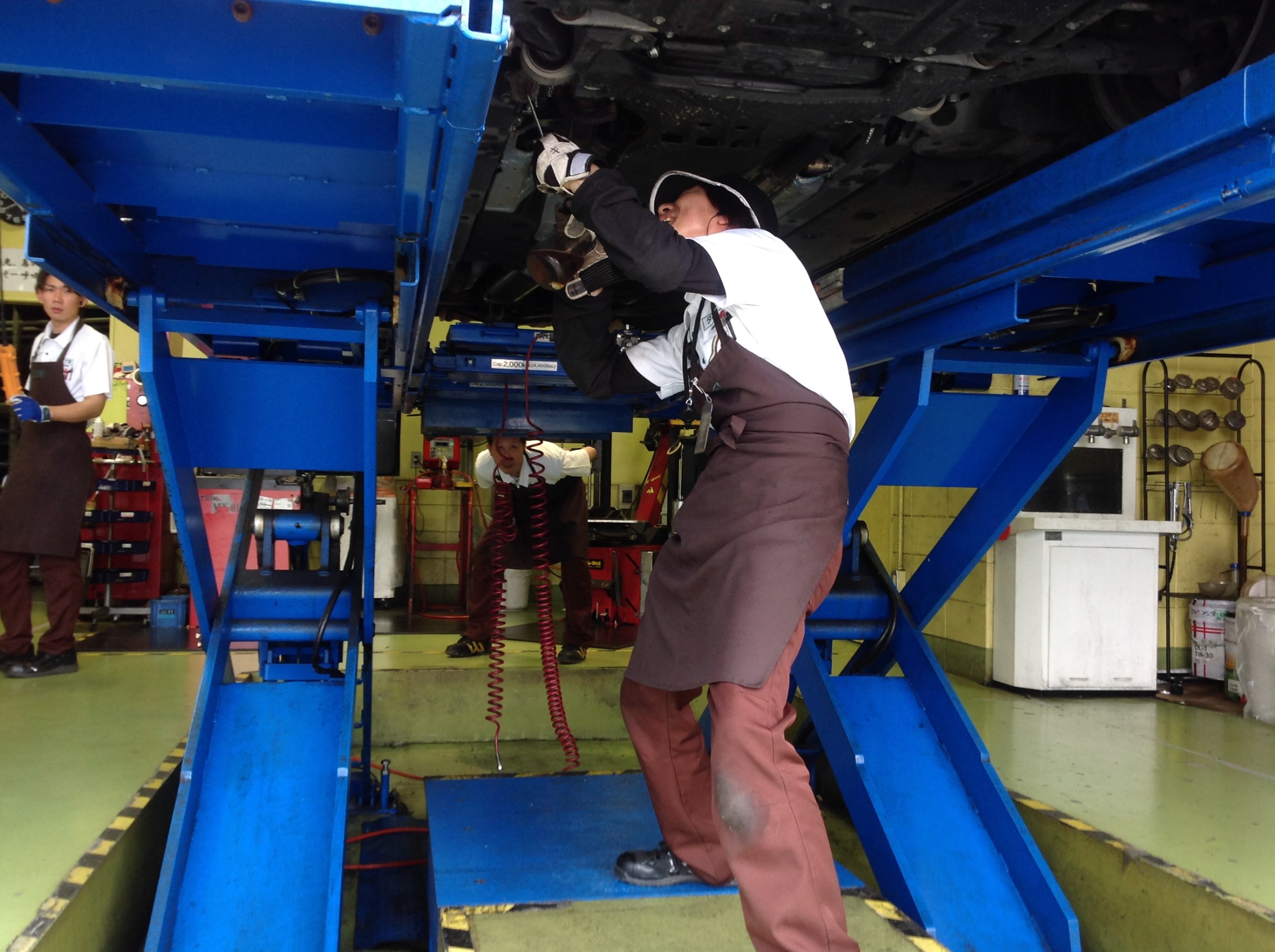当店ではピットリフトに上がったお客様のお車のお腹(シャシー)を