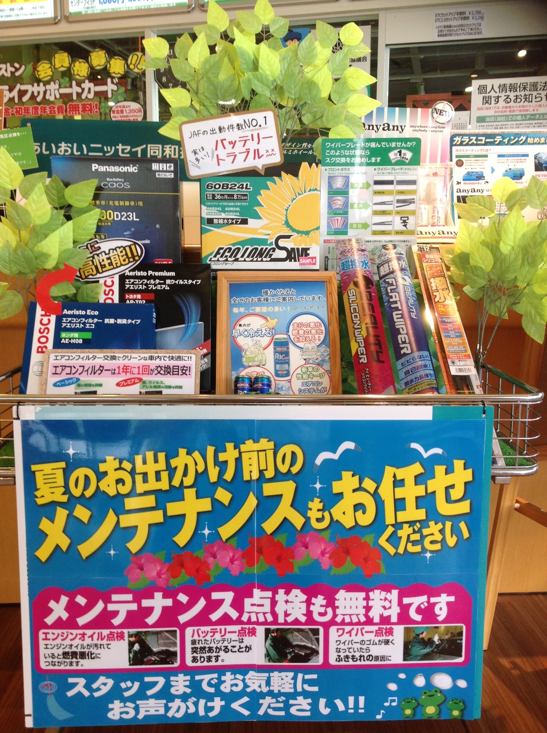 今回は、明日から決算セール開催と言うことで当店の『夏のお出かけ前のメンテナンスコーナー』の紹介をさせて頂きます(o^∇^o)ノ