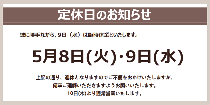 ☆5月8日は定休日・9日は臨時休業となります☆ ポスト 2018年5月7日 タイヤ館GP大阪箕面WEBご覧頂きまして、ありがとうございます(。・ω・)ノ゙ 明日 5月8日(火曜)は通常定休ですが 5月9日(水曜) 臨時休業致します。 5月10日(木)より通常営業致しますので、ご迷惑お掛けしますが宜しくお願いします。 担当:スタッフ一同
