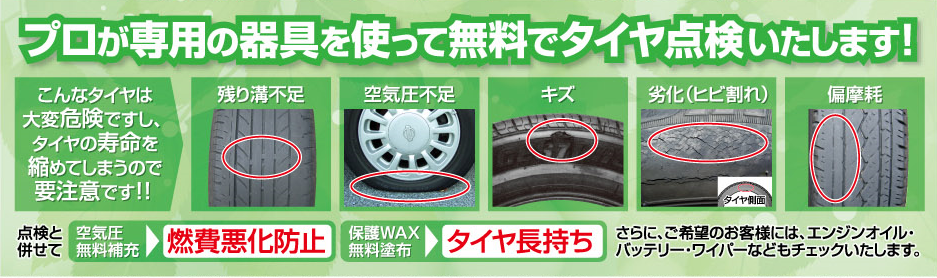 ☆タイヤ点検してますか~??☆ ポスト 2019年3月21日 こんにちは~!! 3月ももう半ばですね~!平日に出かけても人がいっぱいで驚きました(笑) 大学生は春休みなんですかね~(*´∇`*) これだけ天気も良くてぽかぽかしているとお車を使う機会も多くなると思います!! 皆さまはタイヤのチェック以前いつされましたか?? タイヤ館では空気圧・溝・摩耗等の点検も無料でしっかりさせて頂きます! お出掛けや、長距離走る前に是非お立ち寄りくださいませ!!