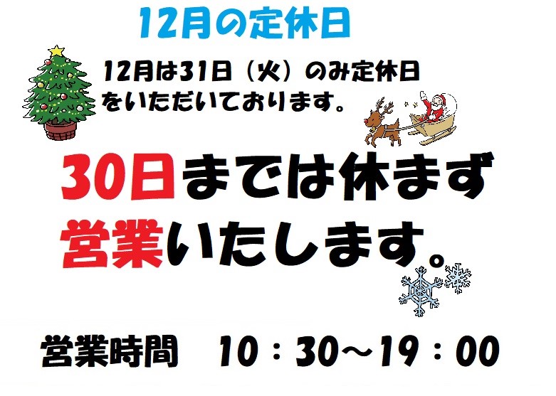 ☆12月の定休日のご案内☆ ポスト 2019年12月1日 いつもタイヤ館グリーンピット大阪箕面店のWEBをご覧いただきありがとうございます! 12月の定休日は31日(火)となります。 30日までは休まず営業いたしますのでよろしくお願いします。