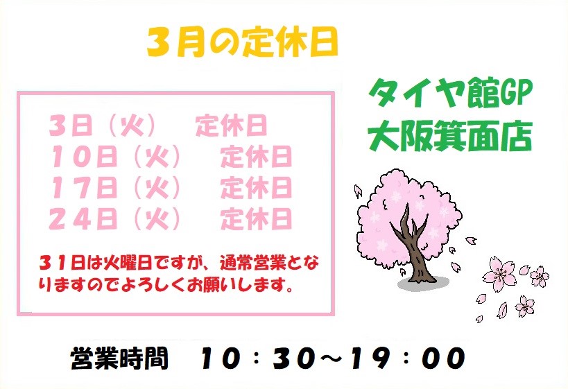 ☆3月の定休日のご案内☆ ポスト 2020年3月1日 いつもタイヤ館グリーンピット大阪箕面店をご利用いただきありがとうございます! 3月の定休日のご案内です! 3月 3日(火) 10日(火) 17日(火) 24日(火) は定休日となっておりますm(__)m 31日は火曜日ですが通常営業となりますので よろしくお願いします。