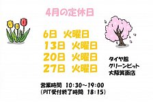 いつもタイヤ館グリーンピット大阪箕面店をご利用いただきありがとうございます!! 今日から4月ですね!エイプリルフール(*^▽^*) ここ2、3日は暖かい日が続いておりますので過ごしやすいですね~! さてさて、今日は4月の定休日のご案内をさせていただきます! 4月 6日 火曜日 13日 火曜日 20日 ...