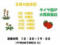 いつもタイヤ館グリーンピット大阪箕面店をご利用いただきありがとうございます! 気温も暖かくなって、過ごしやすくなってきましたね~!! 3月、4月からの新生活の準備をされている方もいらっしゃるのでは ないでしょうか??この時期はいろいろとバタバタしますよね(+o+) そんな忙しい3月、4月で...