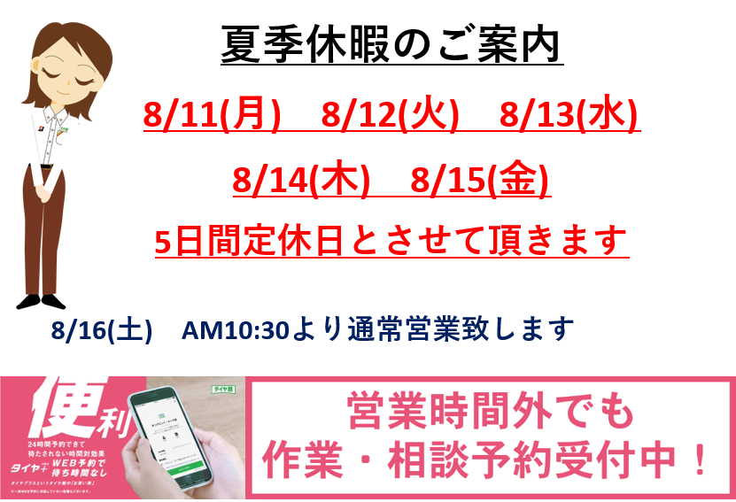 【夏季休暇のご案内】8/11~8/15までお休みとなります☆タイヤ購入は24時間WEBからOK☆作業予約もWEBからできます☆
