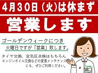 いつもタイヤ館グリーンピット大阪箕面店のWEBをご覧頂き有難う御座います。 4月30日は火曜日ですが、ゴールデンウィークにつき 臨時営業致します!!! ゴールデンウィークのお出掛け前のお車メンテナンスが まだの方は、パンクやバッテリー上がりなどのお車トラブルで 折角のお出掛けが台無し...
