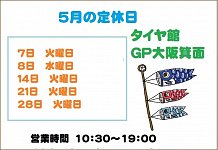 いつもタイヤ館グリーンピット大阪箕面店のWEBをご覧頂きありがとうございます!! 今日で平成も最後ですね~!! 令和でもタイヤ館を宜しくお願いします(*´∇`*) さて、本日は5月の定休日のご案内です! 7日 8日 14日 21日 28日 が定休日となります。 8日は水曜日ですが定休日のなりますので宜...