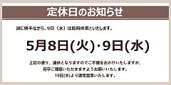 タイヤ館GP大阪箕面WEBご覧頂きまして、ありがとうございます(。・ω・)ノ゙ 明日 5月8日(火曜)は通常定休ですが 5月9日(水曜) 臨時休業致します。 5月10日(木)より通常営業致しますので、ご迷惑お掛けしますが宜しくお願いします。