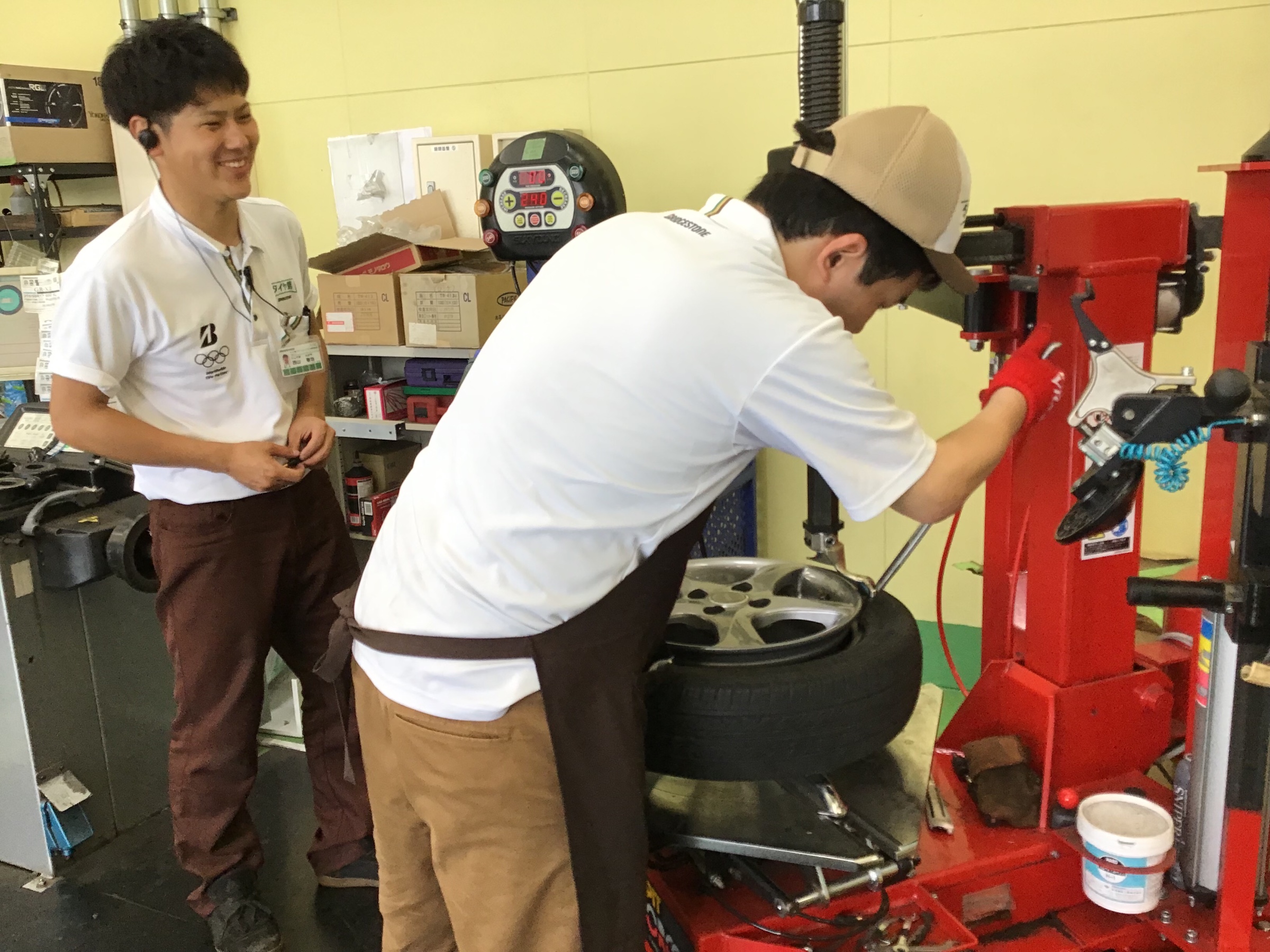 西山スタッフがタイヤ交換の手順を、手取り足取り教えています(*´▽`*)