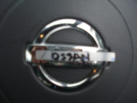 ハンドルの真ん中に『NISSAN』というエンブレムがあるのですが、それが『OSSAN』おっさんのシールが貼られております・・・(ー_ー)!!なんて緻密なイタズラを・・・・!!