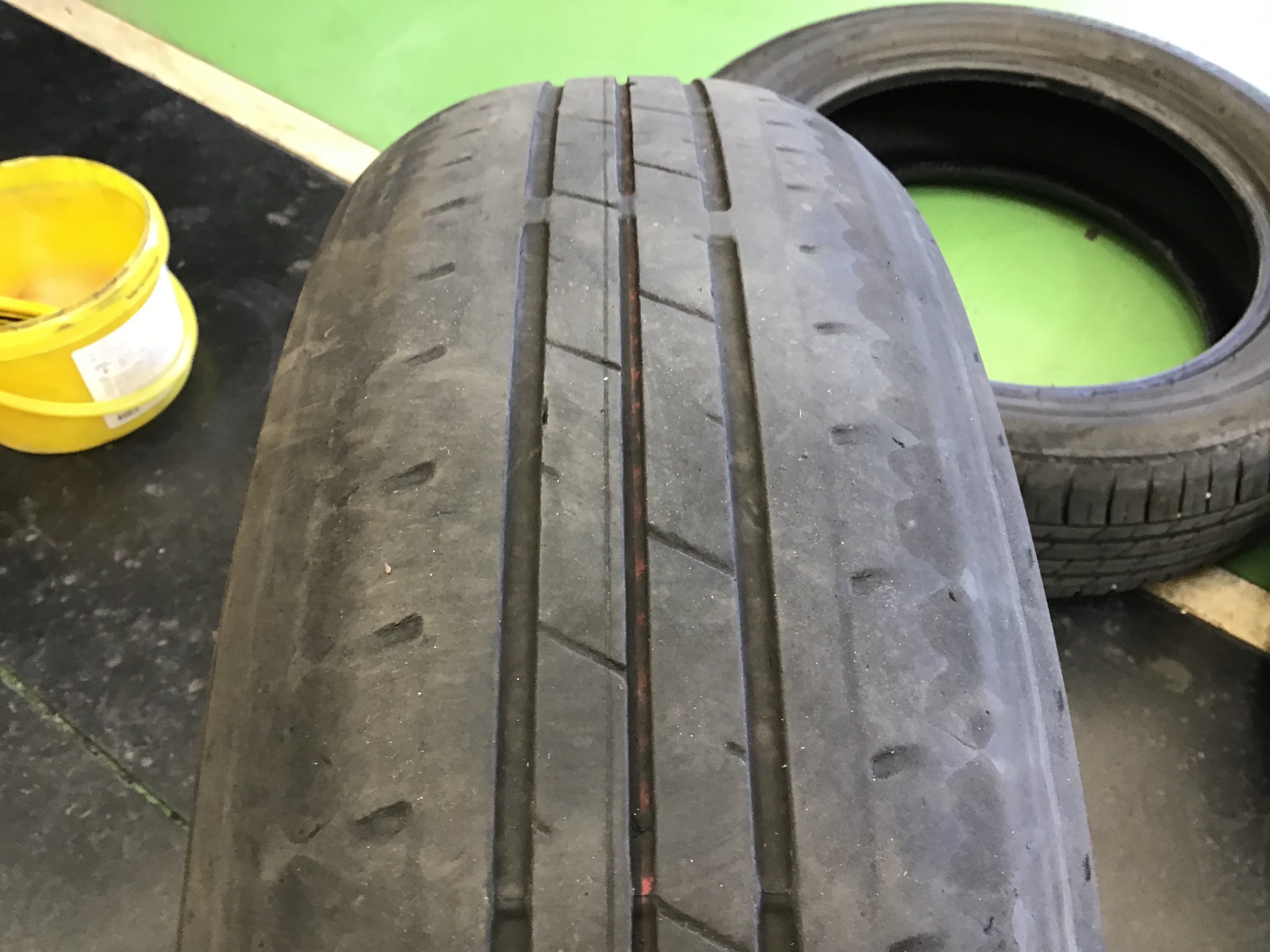 適正空気圧での走行が出来なかった事で、真ん中の部分も車検基準である1.6mmの溝も無くなっていました。