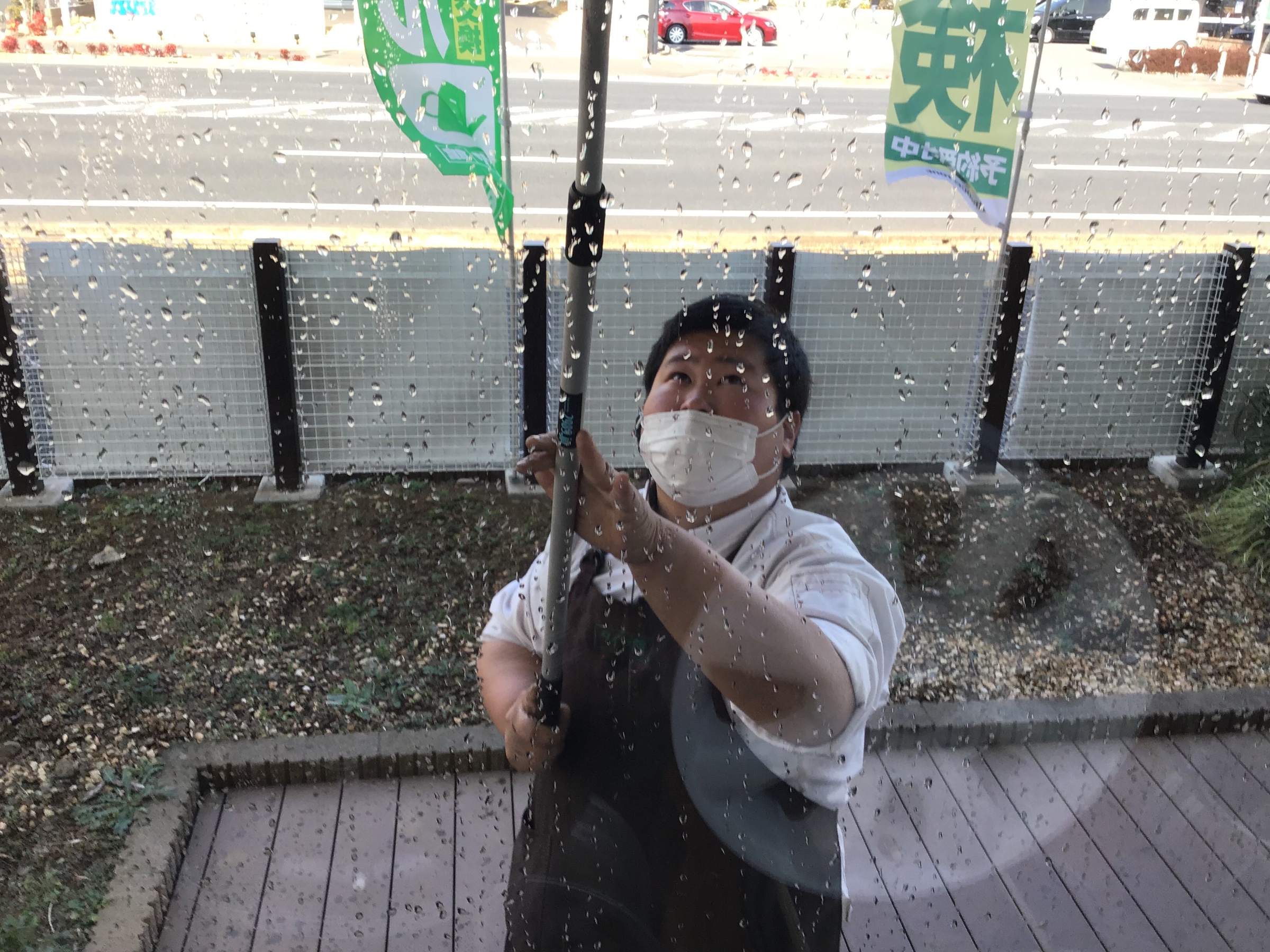 お店の窓に高圧洗浄機でお水をかけて〜〜なんか棒みたいな物を持ち出して〜(^_^)