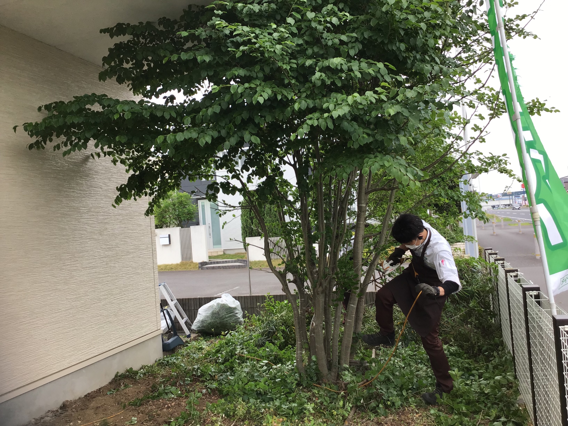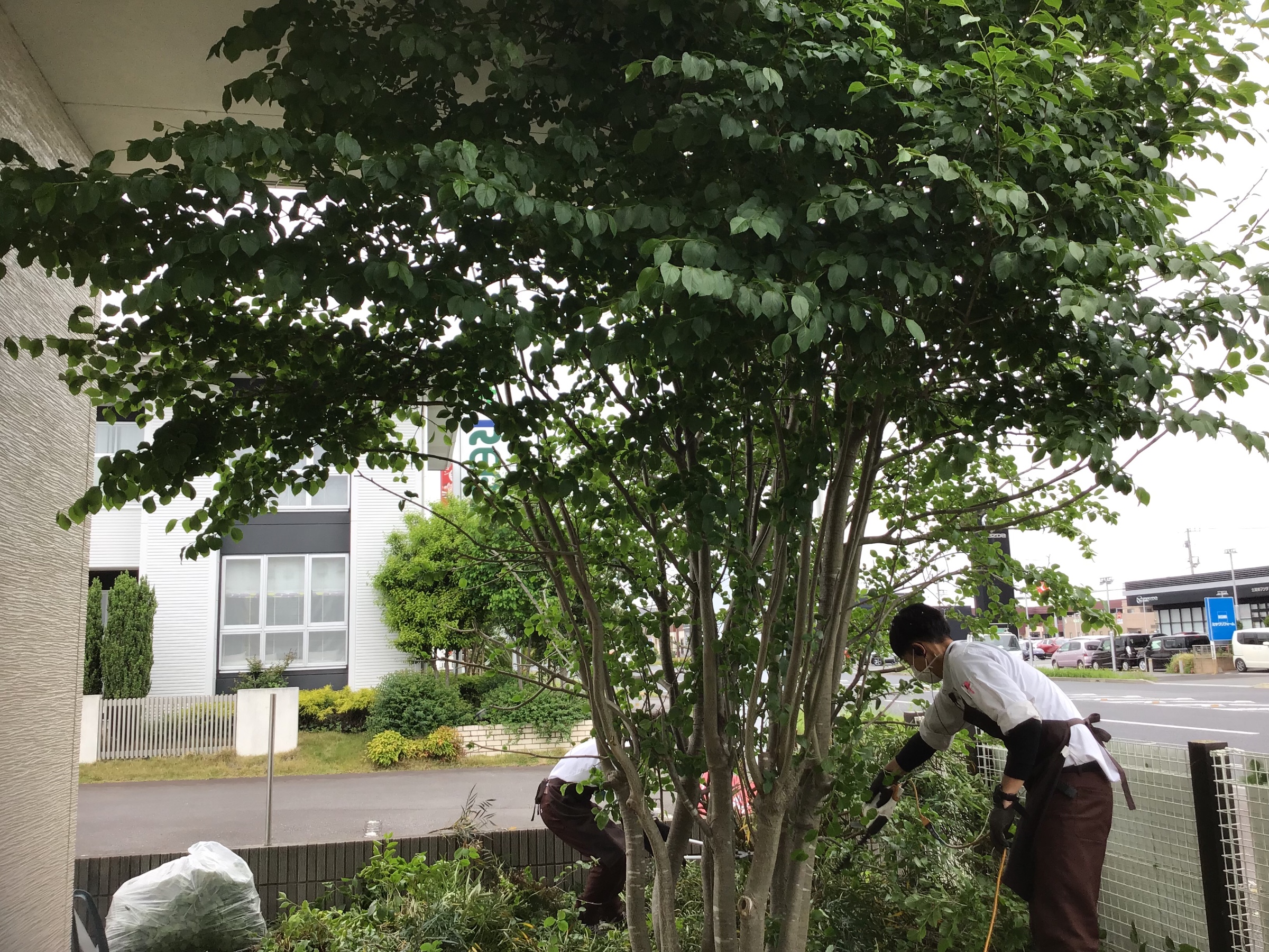 今日は空き時間を確保して、ウットデッキスペースの草取りと木の枝を整えました!!