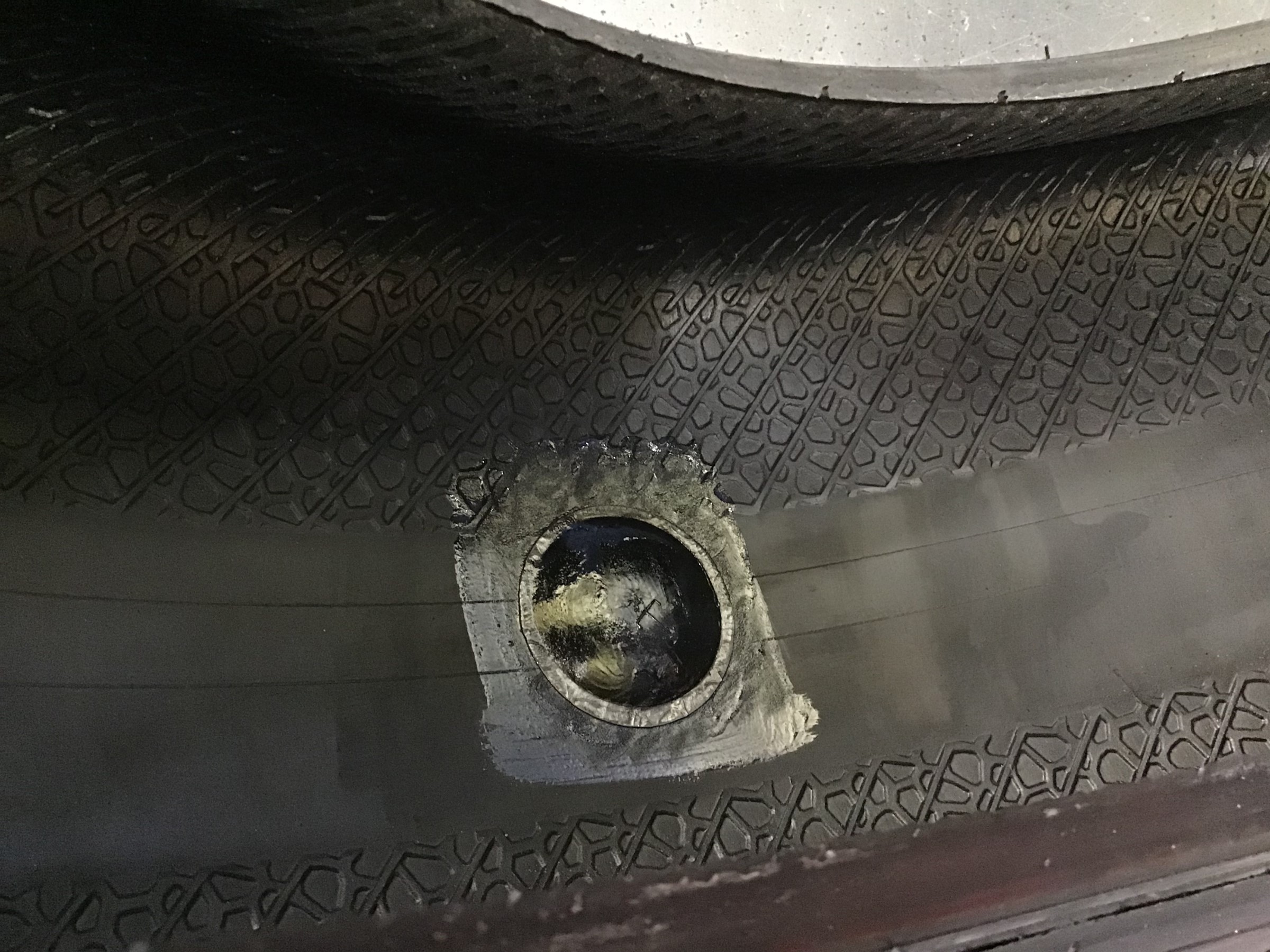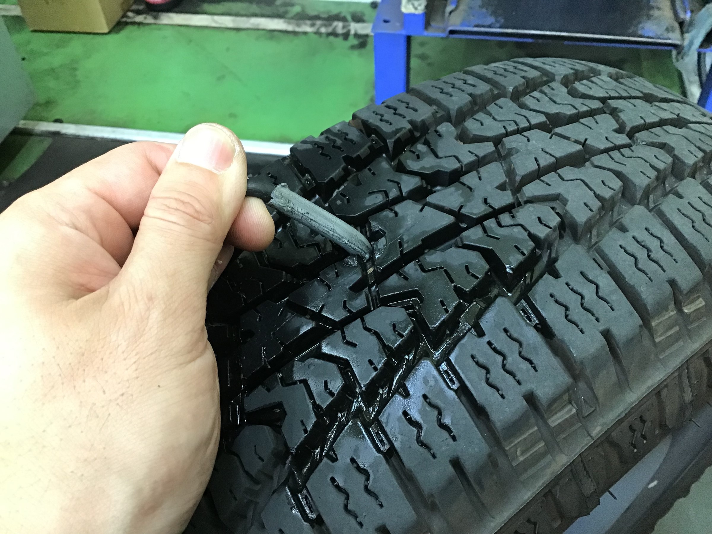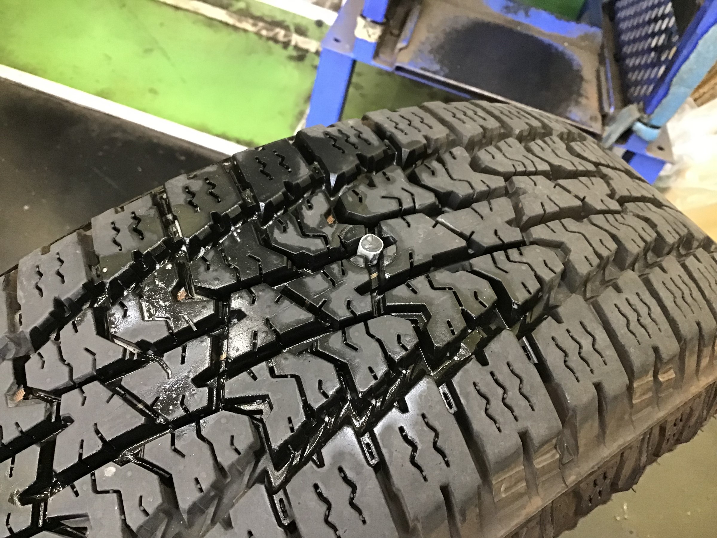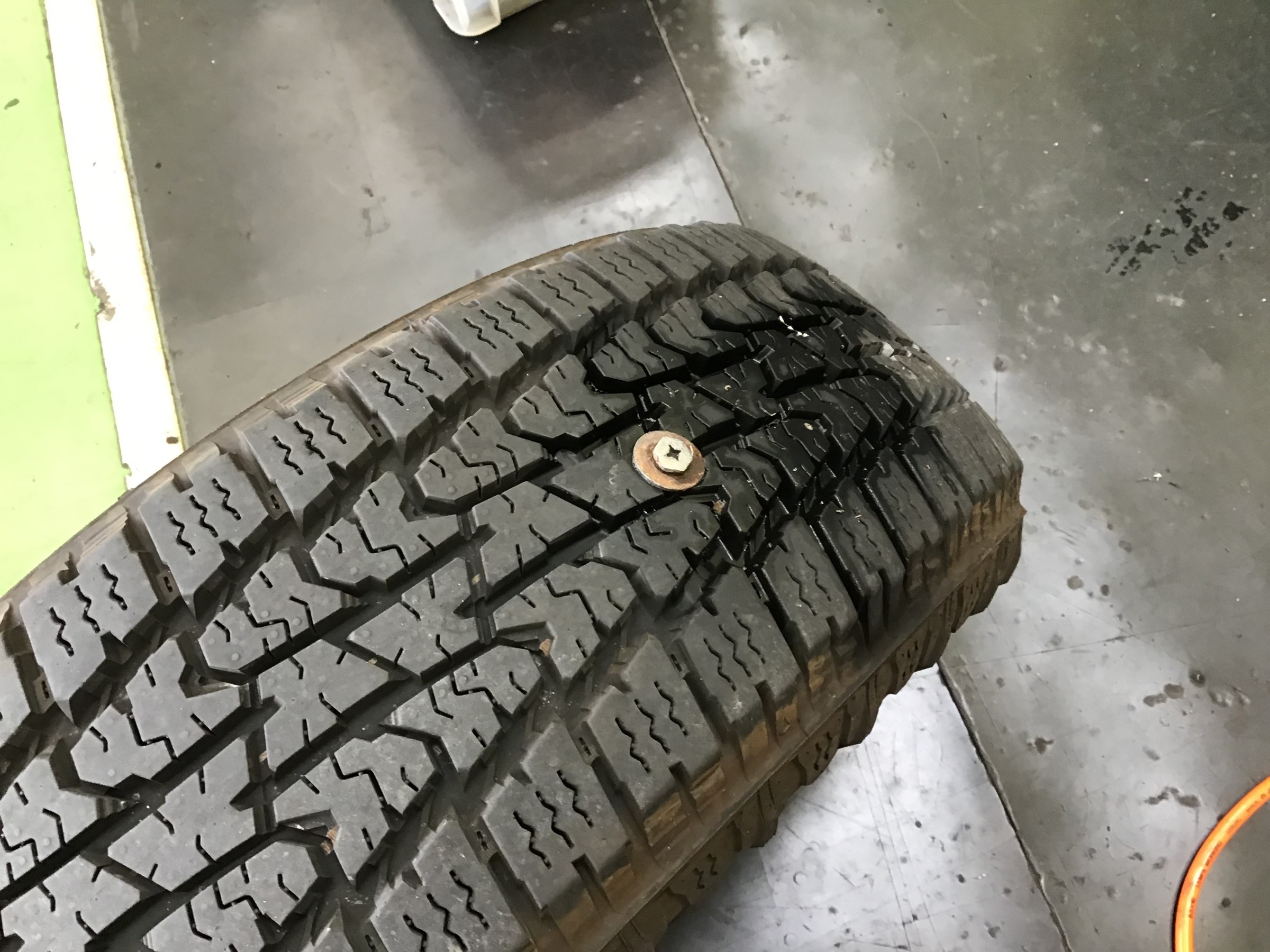 どーーーーん!!! タイヤに太いネジを発見してしまいました( ゚Д゚)