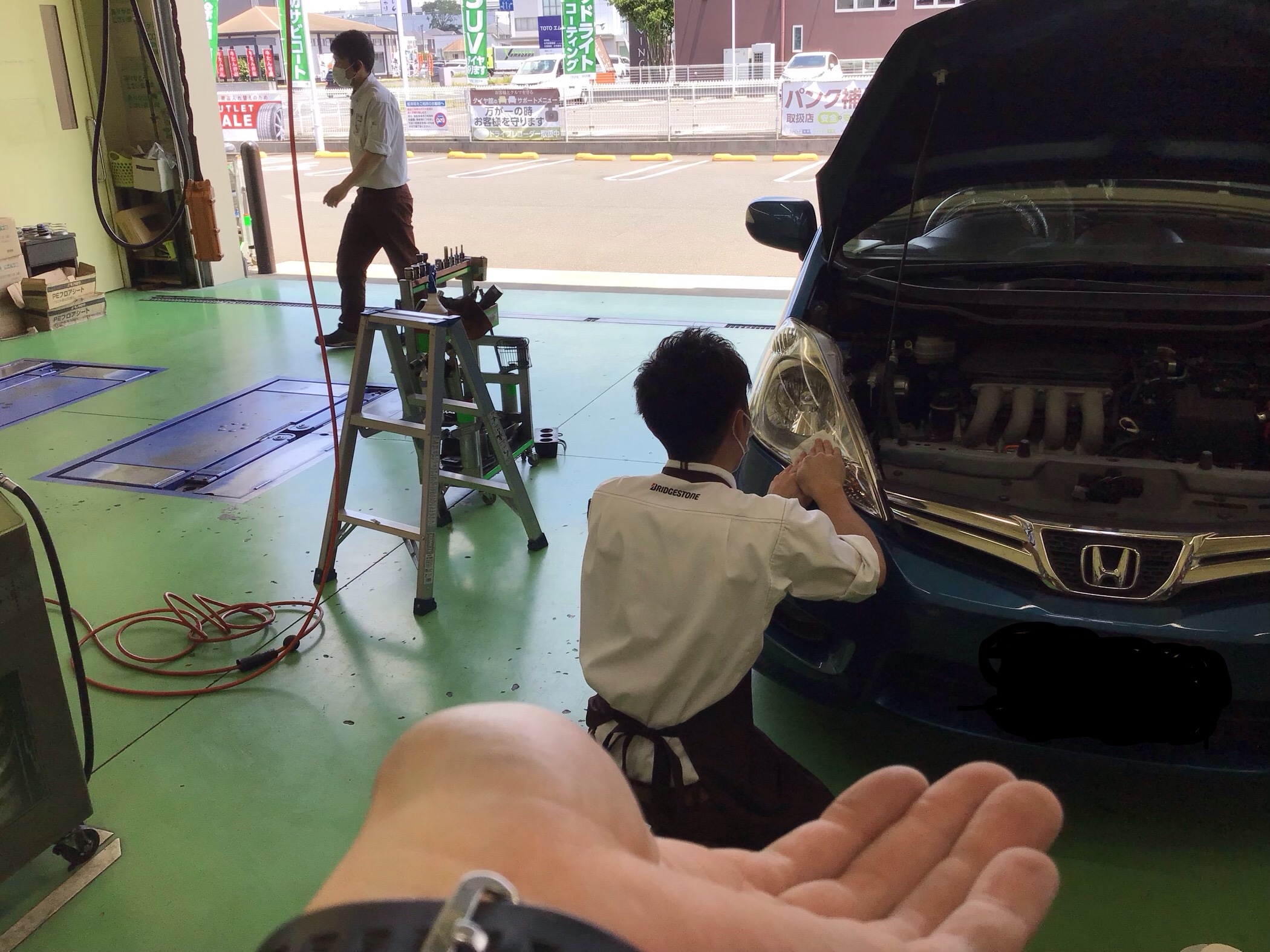 吉澤店長の手の上で作業中です笑