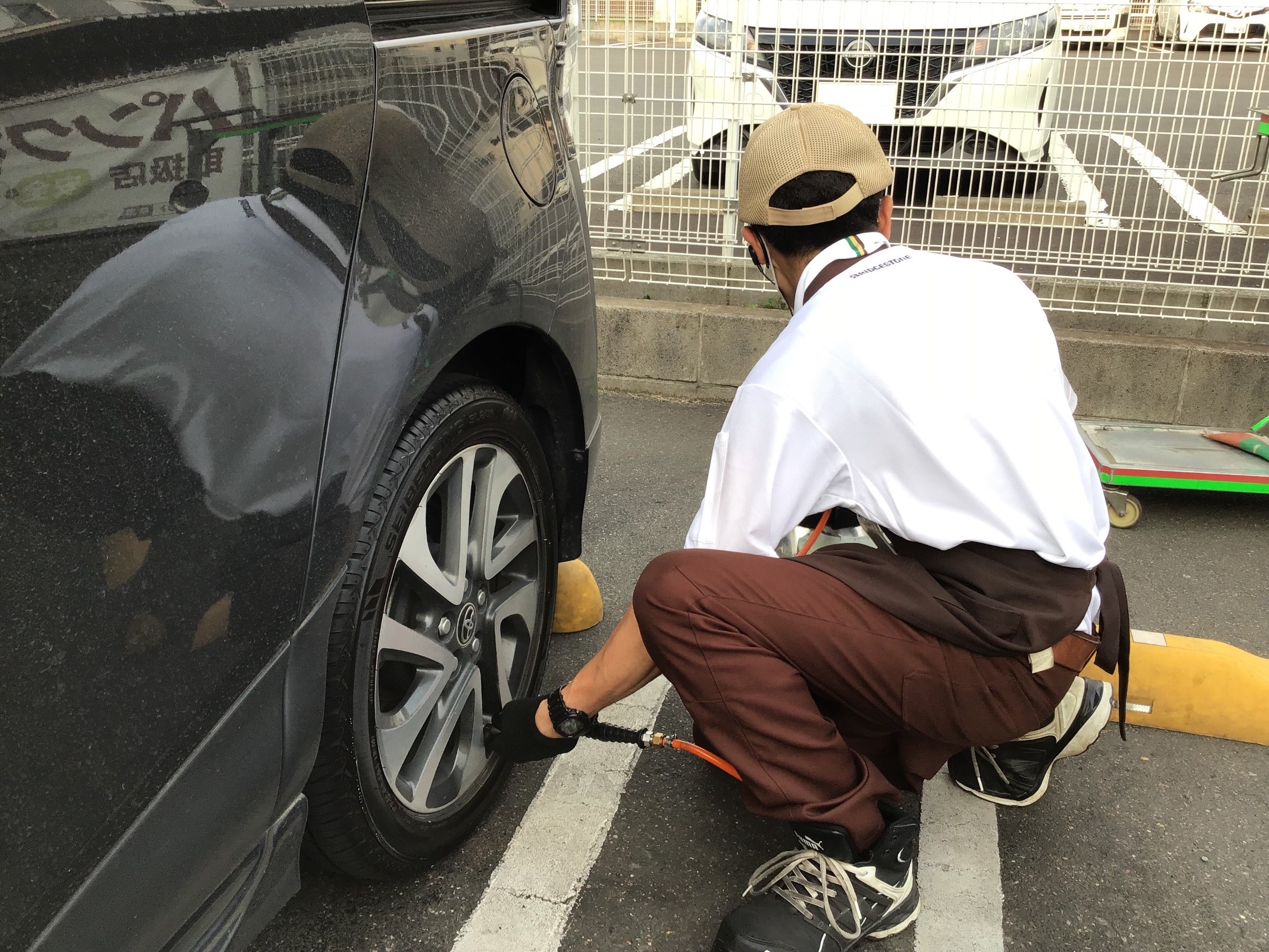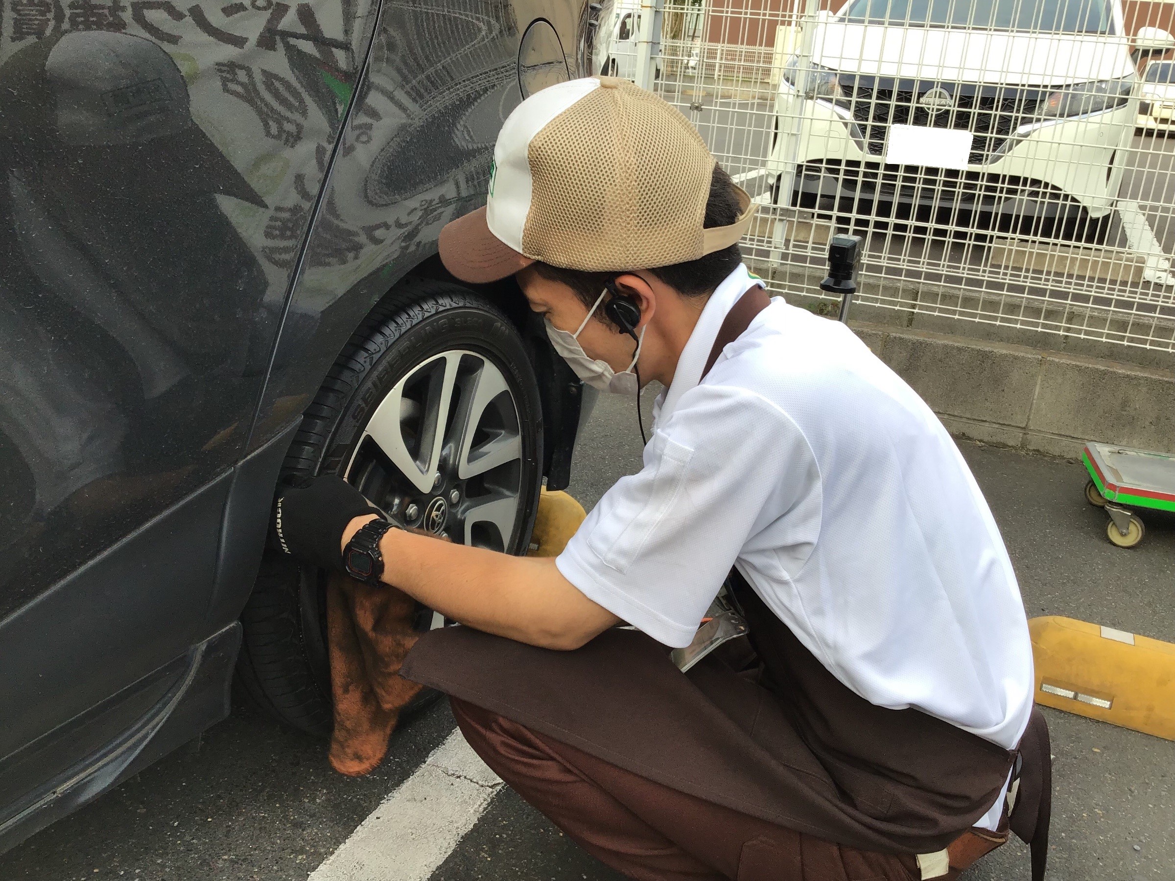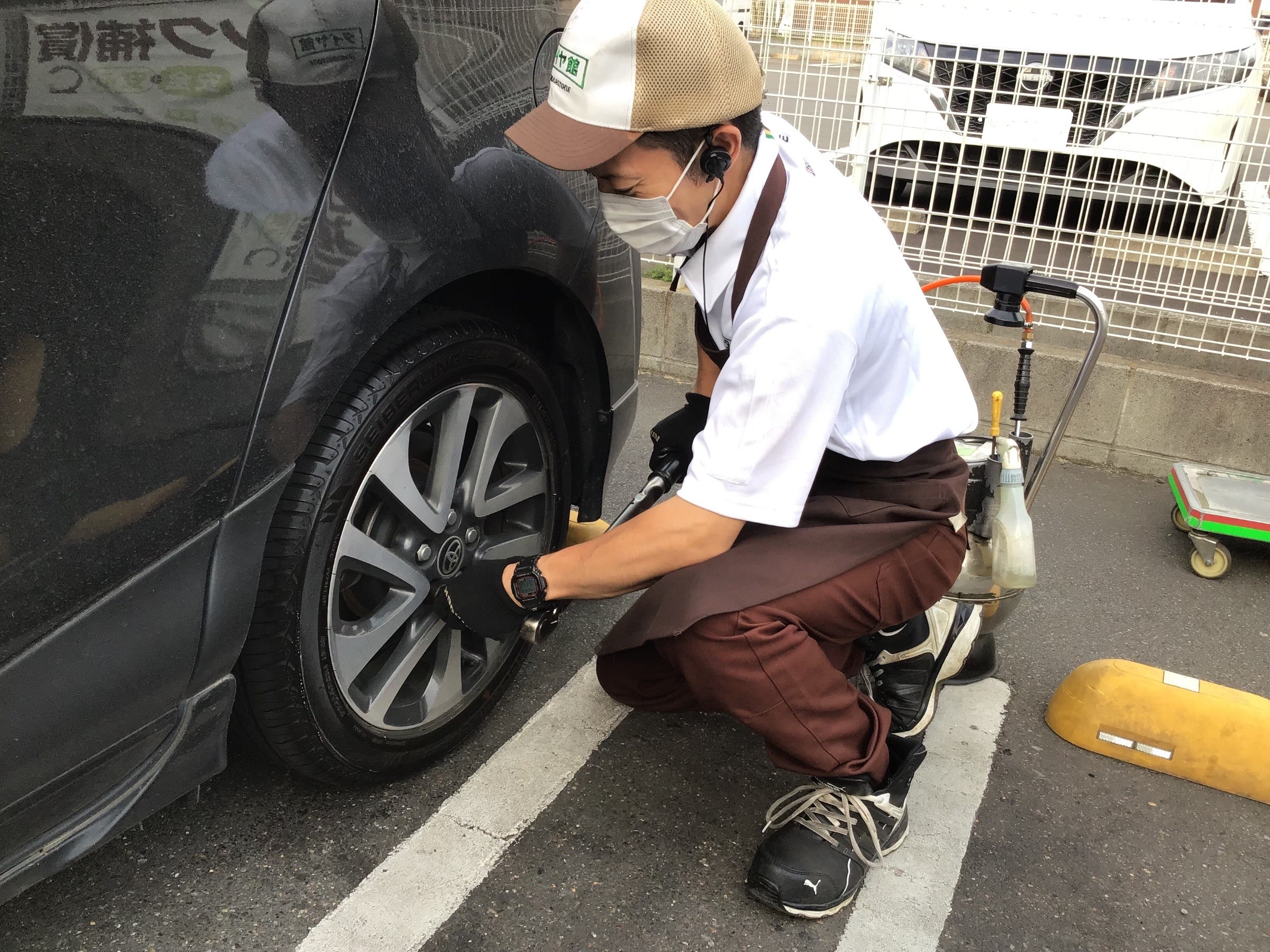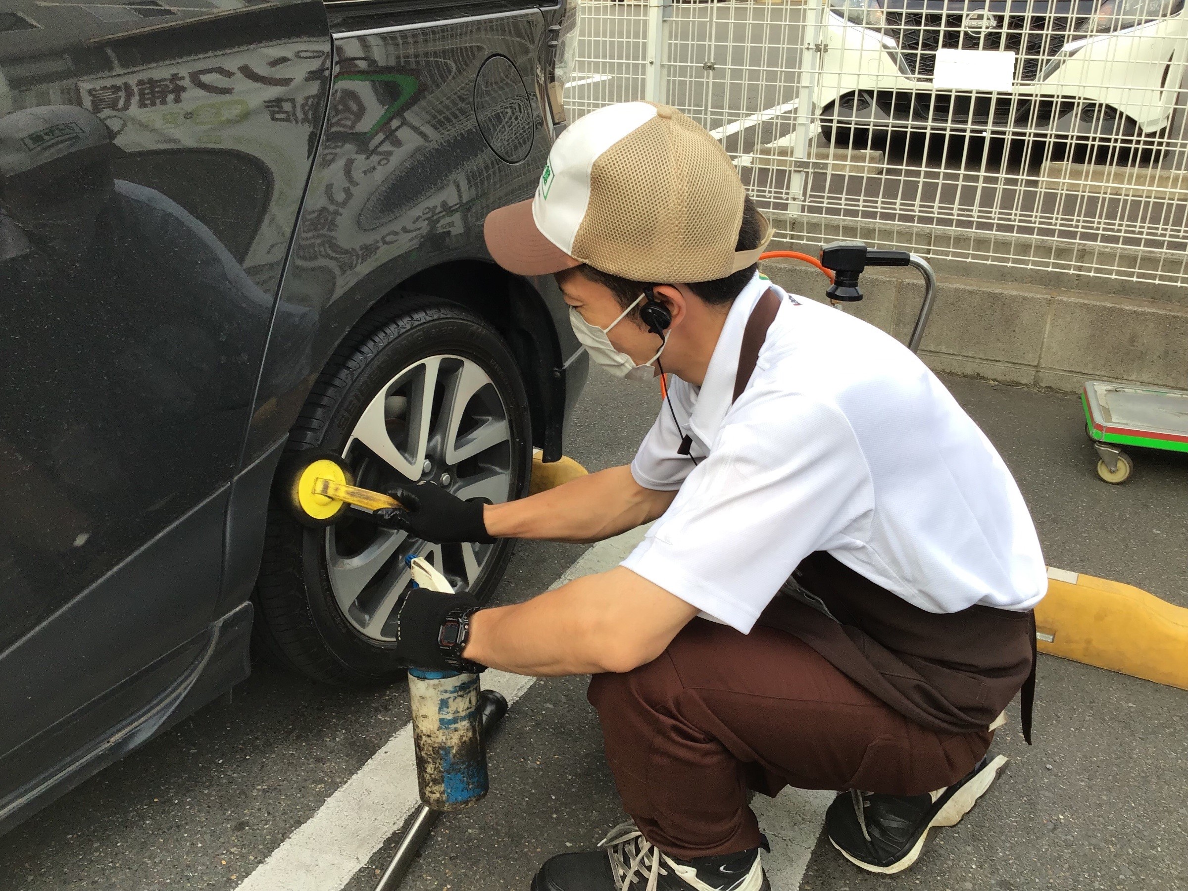 タイヤ(ホイール)装着後に回転して熱が加わり膨張する事によってナットの増し締めが必要となりますので点検し、増し締めをする必要があります。