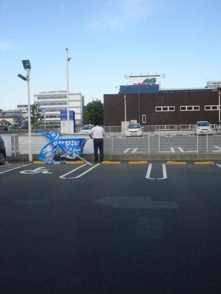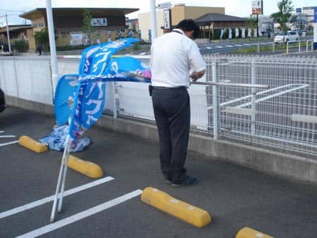 マネージャーが、店頭ののぼりを交換していました。