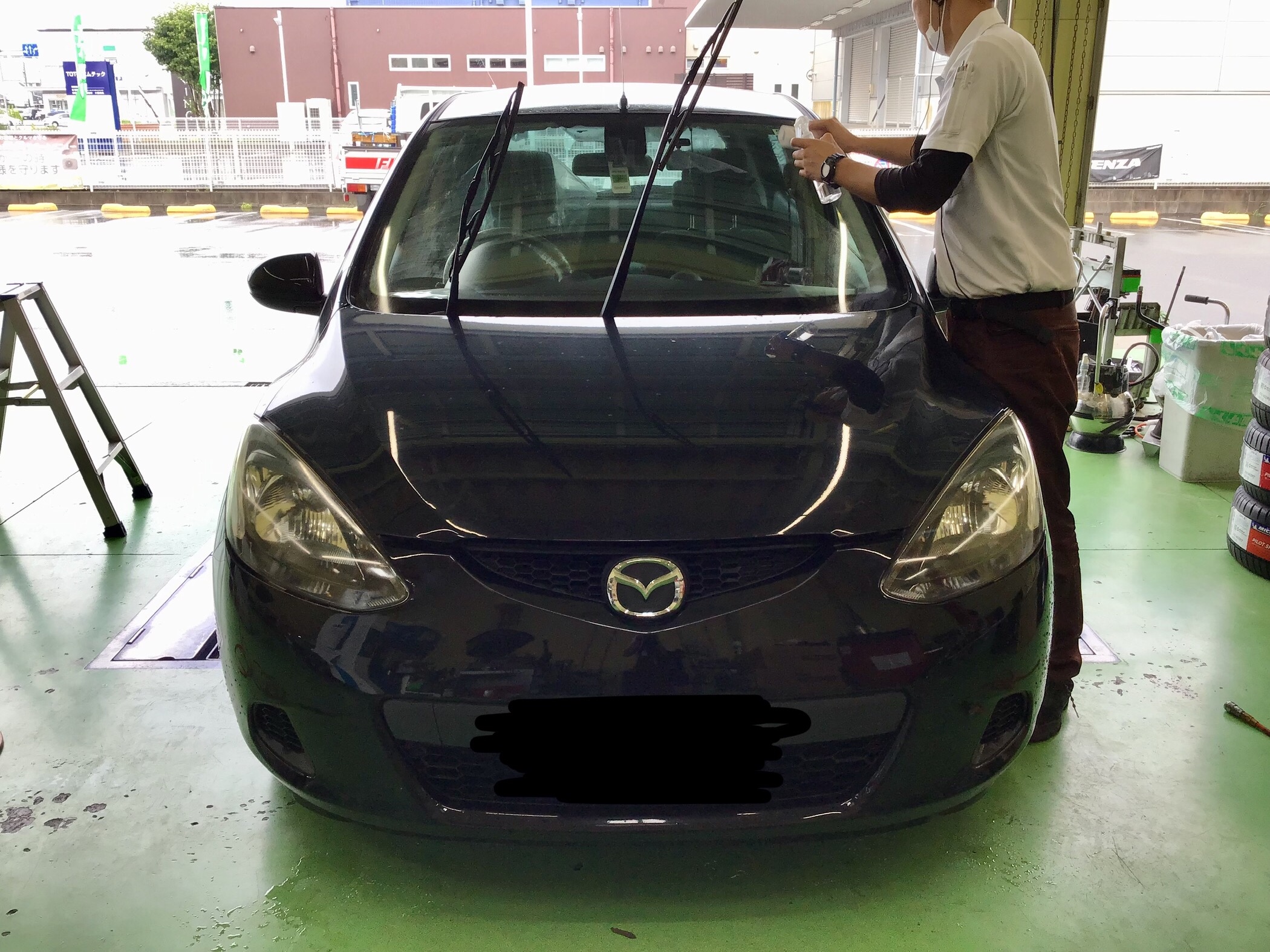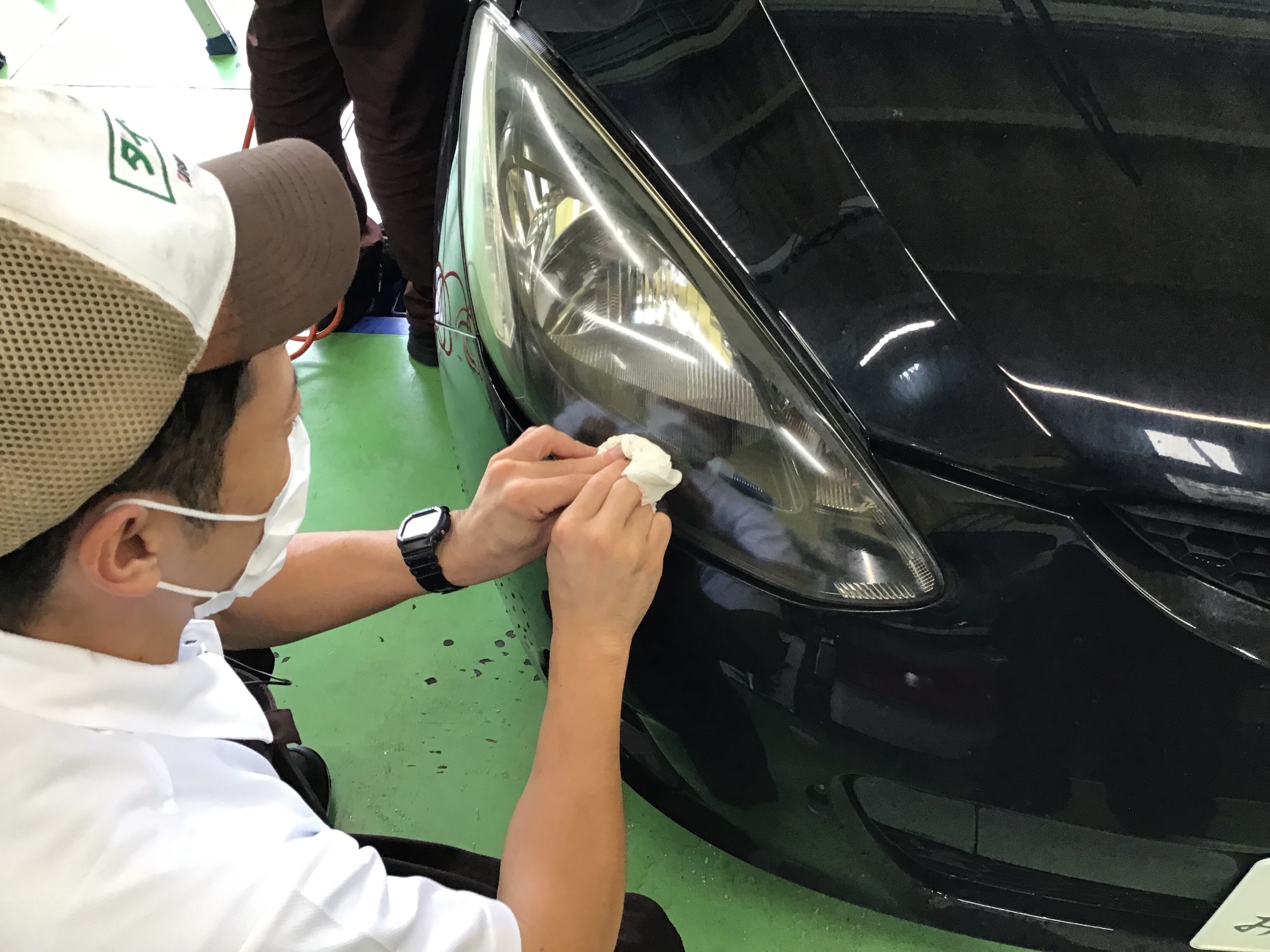 自分がヘッドライトコーティングを行なっている間に吉澤店長が撥水コーティングを٩( 'ω' )و