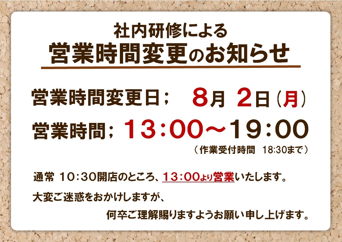 本日8月2日(月)は、社内研修のため営業時間が変わります。