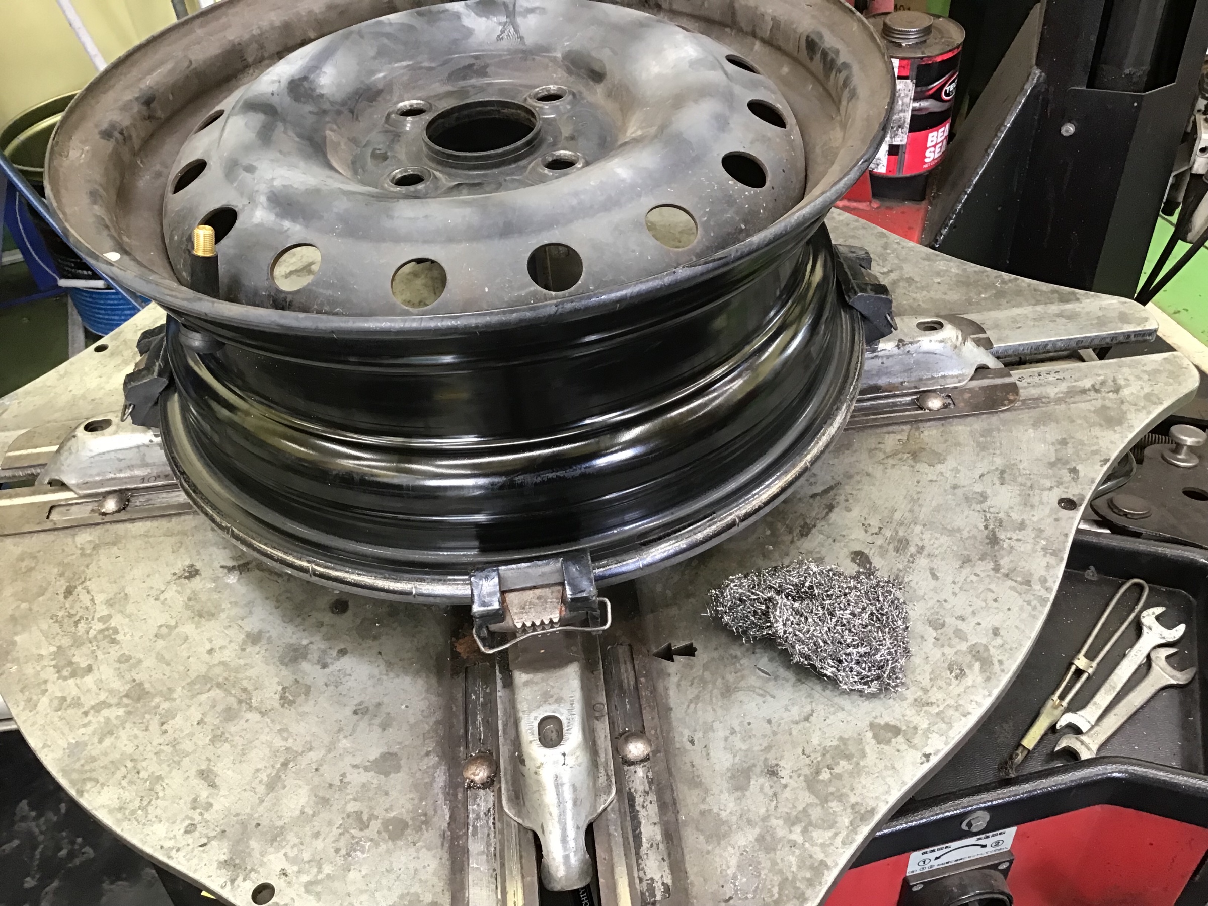 古いタイヤを剥がして、ホイールに付着したタイヤカスを削っていきます!!