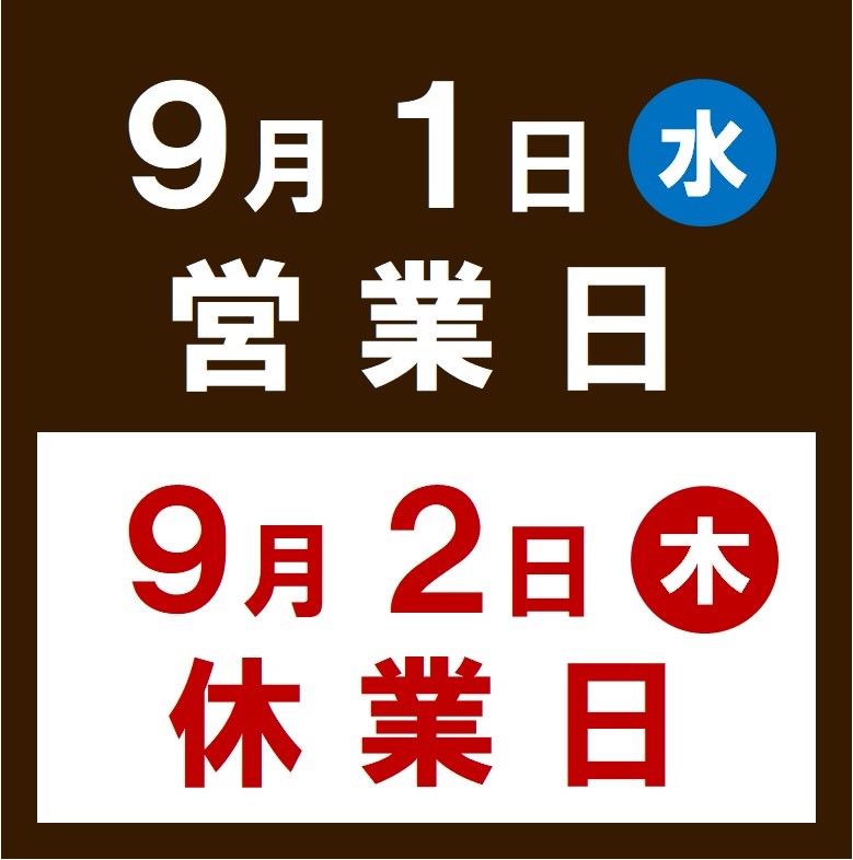 9/1(水)営業・9/2(木)休業いたします